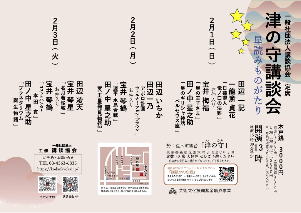 講談協会初席(津の守) 13:00 講談協会初席(津の守) @ 荒木町舞台「津の守」 1月 1 @ 13:00 ![]() 2026年津の守講談会初席は1日~4日まで開催 講談協会の定席です チケット予約のフォームからご予約できます 開演:13時 終演:15時45分頃(前後することがあります) 料金:当日3,000円/予約2,800円/ご贔屓連・25歳以下(要証明書提示)2,000円 出演:小琴/貞奈/凌鶴/仲入り/一凜/琴調 問合せ:03-4363-6335 講談協会 講談協会初席(木馬亭) 17:30 講談協会初席(木馬亭) @ 木馬亭 1月 1 @ 17:30 ![]() 講談協会の定席です チケット予約のフォームからご予約できます 開演:17時30分 料金:当日3,000円/予約2,800円/ご贔屓連・25歳以下(要証明書提示)2,000円 出演:前座大喜利/伊織/貞弥/琴鶴/貞橘/仲入り/真打大喜利/あおい/琴調 問合せ:03-4363-6335 講談協会 ※講談協会チケット予約フォームからご予約の際は、“ご予約の会”の項に「初席(夜)」をご選択ください。 | 【予約受付終了】講談協会初席(津の守) 13:00 【予約受付終了】講談協会初席(津の守) @ 荒木町舞台「津の守」 1月 2 @ 13:00 ![]() ※当会の予約受付は終了いたしました 2026年津の守講談会初席は1日~4日まで開催 講談協会の定席です 開演:13時 終演:15時45分頃(前後することがあります) 料金:当日3,000円/予約2,800円/ご贔屓連・25歳以下(要証明書提示)2,000円 出演:一記/いちか/春陽/仲入り/貞弥/琴星 問合せ:03-4363-6335 講談協会 講談協会若手初席(連雀亭) 18:00 講談協会若手初席(連雀亭) @ 連雀亭 1月 2 @ 18:00 ![]() 講談協会の定席です チケット予約のフォームからご予約できます 開演:18時 料金:当日・予約ともに2,500円/ご贔屓連・25歳以下(要証明書提示)2,000円 出演:一記/琴凌/仲入り/こなぎ/貞弥 問合せ:03-4363-6335 講談協会 メール:takaraikinryo@gmail.com ※講談協会チケット予約フォームからご予約の際は、“ご予約の会”の項に「初席(夜)」をご選択ください。 ※takaraikinryo@gmail.com よりご予約の際は、お名前、連絡先、予約枚数と、連雀亭初席予約希望とお書き添えください。 ※19時50分頃終演予定 | 本牧亭講談会 13:00 本牧亭講談会 @ 御茶ノ水 スカイルーム太陽 1月 3 @ 13:00 ![]() 本牧亭主催の講談会です 開演:13時 料金:2,000円 出演:前座/菫花/一乃/仲入り/柳家風柳/琴調 問合せ:090-3203-9040 清水 講談協会初席(津の守) 13:00 講談協会初席(津の守) @ 荒木町舞台「津の守」 1月 3 @ 13:00 ![]() 2026年津の守講談会初席は1日~4日まで開催 講談協会の定席です チケット予約のフォームからご予約できます 開演:13時 終演:15時45分頃(前後することがあります) 料金:当日3,000円/予約2,800円/ご贔屓連・25歳以下(要証明書提示)2,000円 出演:伊織/琴凌/あおい/仲入り/山緑/香織 問合せ:03-4363-6335 講談協会 講談協会若手初席(連雀亭) 18:00 講談協会若手初席(連雀亭) @ 連雀亭 1月 3 @ 18:00 ![]() 講談協会の定席です チケット予約のフォームからご予約できます 開演:18時 料金:当日・予約ともに2,500円/ご贔屓連・25歳以下(要証明書提示)2,000円 出演:小琴/菫花/仲入り/凌天/鶴遊 問合せ:03-4363-6335 講談協会 メール:takaraikinryo@gmail.com ※講談協会チケット予約フォームからご予約の際は、“ご予約の会”の項に「初席(夜)」をご選択ください。 ※takaraikinryo@gmail.com よりご予約の際は、お名前、連絡先、予約枚数と、連雀亭初席予約希望とお書き添えください。 ※19時50分頃終演予定 | ||||