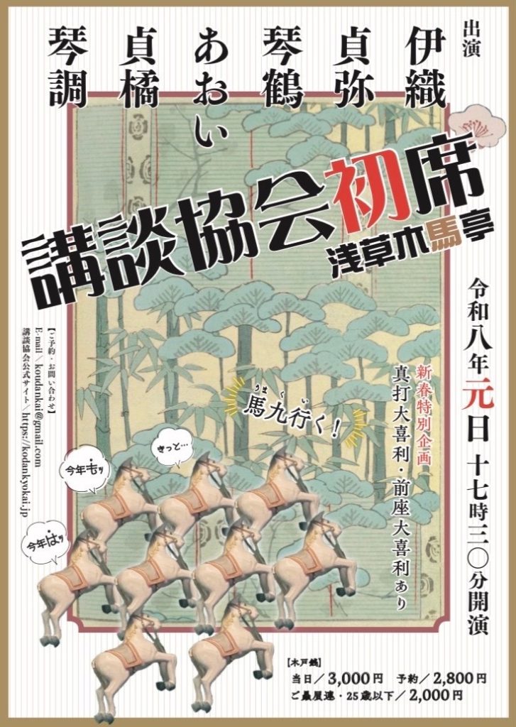 講談協会初席(津の守) 13:00 講談協会初席(津の守) @ 荒木町舞台「津の守」 1月 1 @ 13:00 ![]() 2026年津の守講談会初席は1日~4日まで開催 講談協会の定席です チケット予約のフォームからご予約できます 開演:13時 終演:15時45分頃(前後することがあります) 料金:当日3,000円/予約2,800円/ご贔屓連・25歳以下(要証明書提示)2,000円 出演:小琴/貞奈/凌鶴/仲入り/一凜/琴調 問合せ:03-4363-6335 講談協会 講談協会初席(木馬亭) 17:30 講談協会初席(木馬亭) @ 木馬亭 1月 1 @ 17:30 ![]() 講談協会の定席です チケット予約のフォームからご予約できます 開演:17時30分 料金:当日3,000円/予約2,800円/ご贔屓連・25歳以下(要証明書提示)2,000円 出演:前座大喜利/伊織/貞弥/琴鶴/貞橘/仲入り/真打大喜利/あおい/琴調 問合せ:03-4363-6335 講談協会 ※講談協会チケット予約フォームからご予約の際は、“ご予約の会”の項に「初席(夜)」をご選択ください。 | 【予約受付終了】講談協会初席(津の守) 13:00 【予約受付終了】講談協会初席(津の守) @ 荒木町舞台「津の守」 1月 2 @ 13:00 ![]() ※当会の予約受付は終了いたしました 2026年津の守講談会初席は1日~4日まで開催 講談協会の定席です 開演:13時 終演:15時45分頃(前後することがあります) 料金:当日3,000円/予約2,800円/ご贔屓連・25歳以下(要証明書提示)2,000円 出演:一記/いちか/春陽/仲入り/貞弥/琴星 問合せ:03-4363-6335 講談協会 講談協会若手初席(連雀亭) 18:00 講談協会若手初席(連雀亭) @ 連雀亭 1月 2 @ 18:00 ![]() 講談協会の定席です チケット予約のフォームからご予約できます 開演:18時 料金:当日・予約ともに2,500円/ご贔屓連・25歳以下(要証明書提示)2,000円 出演:一記/琴凌/仲入り/こなぎ/貞弥 問合せ:03-4363-6335 講談協会 メール:takaraikinryo@gmail.com ※講談協会チケット予約フォームからご予約の際は、“ご予約の会”の項に「初席(夜)」をご選択ください。 ※takaraikinryo@gmail.com よりご予約の際は、お名前、連絡先、予約枚数と、連雀亭初席予約希望とお書き添えください。 ※19時50分頃終演予定 | 本牧亭講談会 13:00 本牧亭講談会 @ 御茶ノ水 スカイルーム太陽 1月 3 @ 13:00 ![]() 本牧亭主催の講談会です 開演:13時 料金:2,000円 出演:前座/菫花/一乃/仲入り/柳家風柳/琴調 問合せ:090-3203-9040 清水 講談協会初席(津の守) 13:00 講談協会初席(津の守) @ 荒木町舞台「津の守」 1月 3 @ 13:00 ![]() 2026年津の守講談会初席は1日~4日まで開催 講談協会の定席です チケット予約のフォームからご予約できます 開演:13時 終演:15時45分頃(前後することがあります) 料金:当日3,000円/予約2,800円/ご贔屓連・25歳以下(要証明書提示)2,000円 出演:伊織/琴凌/あおい/仲入り/山緑/香織 問合せ:03-4363-6335 講談協会 講談協会若手初席(連雀亭) 18:00 講談協会若手初席(連雀亭) @ 連雀亭 1月 3 @ 18:00 ![]() 講談協会の定席です チケット予約のフォームからご予約できます 開演:18時 料金:当日・予約ともに2,500円/ご贔屓連・25歳以下(要証明書提示)2,000円 出演:小琴/菫花/仲入り/凌天/鶴遊 問合せ:03-4363-6335 講談協会 メール:takaraikinryo@gmail.com ※講談協会チケット予約フォームからご予約の際は、“ご予約の会”の項に「初席(夜)」をご選択ください。 ※takaraikinryo@gmail.com よりご予約の際は、お名前、連絡先、予約枚数と、連雀亭初席予約希望とお書き添えください。 ※19時50分頃終演予定 | ||||